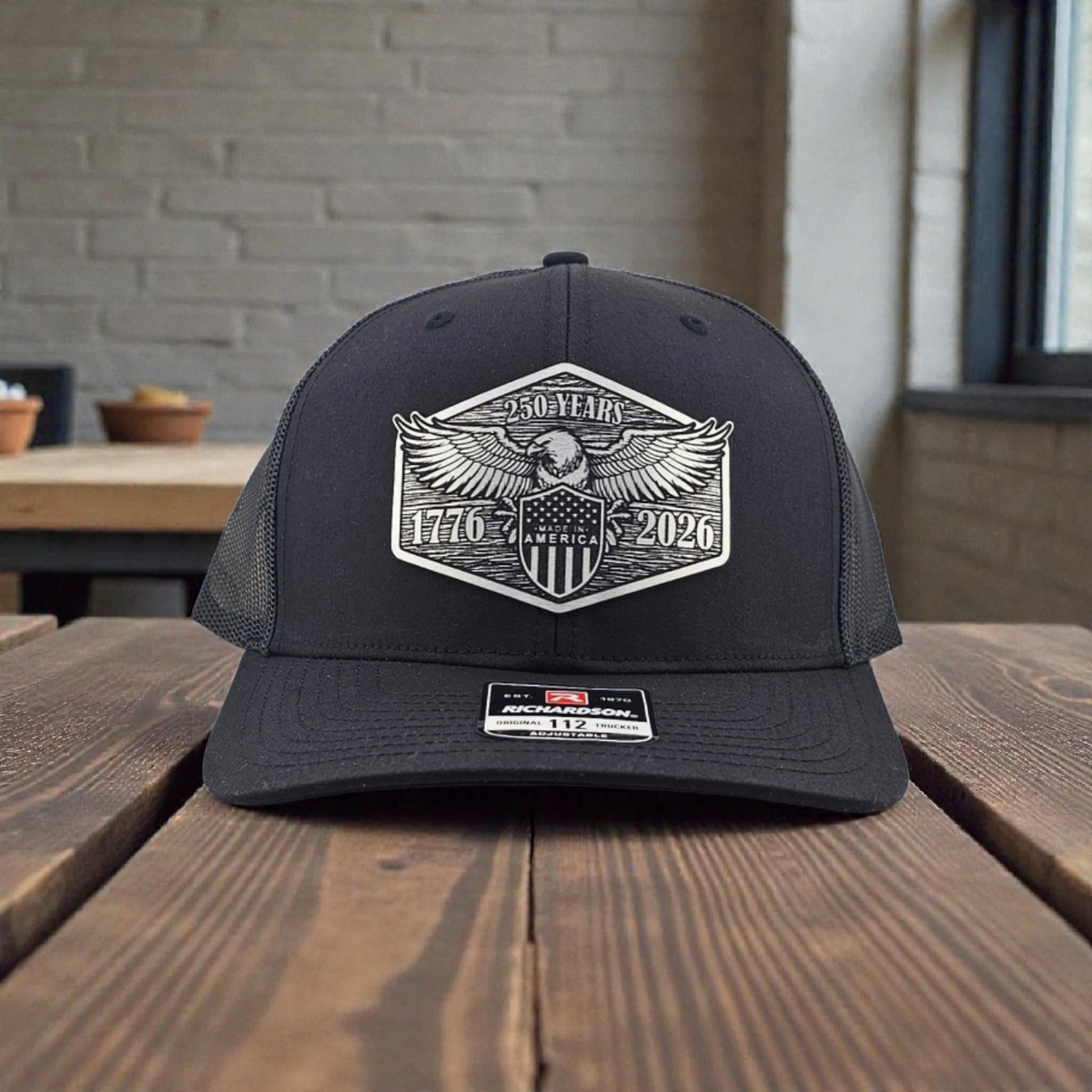 This snapback trucker hat brings patriotic pride to the front of your everyday gear. Featuring a crisp engraved leatherette patch that reads "250 Years 1776 2026", it honors the legacy, grit, and spirit that shaped our nation from the very beginning. Whether you are heading to a cookout, parade, fireworks show, or just repping your love for the red, white, and blue, this hat makes your pride loud and clear.