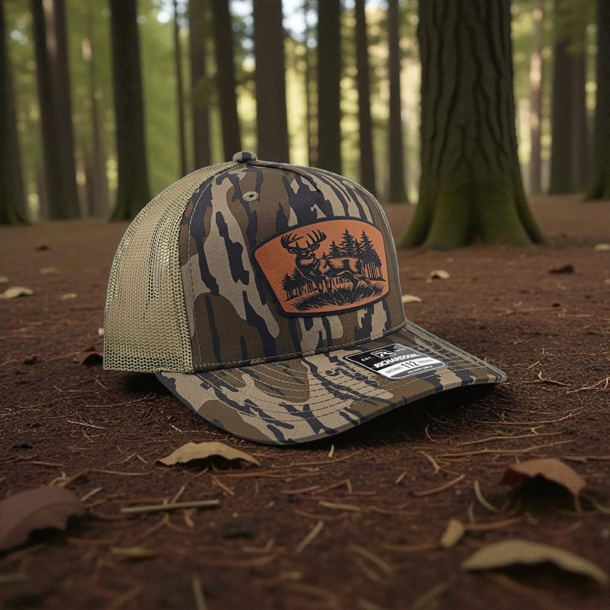 Capture the spirit of the great outdoors with this snapback trucker hat featuring an engraved leatherette patch of a deer in the woods. The detailed engraving brings the forest scene to life, showcasing the quiet strength and beauty of nature’s most iconic animal. It’s the perfect hat for hunters, outdoorsmen, and anyone who feels at home under open skies.
